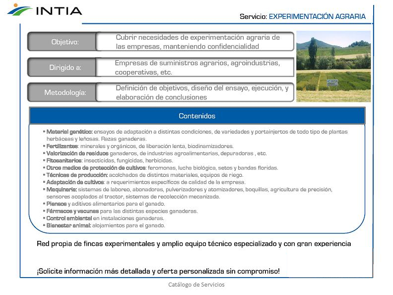 INTIA ofrece un servicio para resolver las necesidades de experimentación agraria de las empresas mediante la realización de ensayos bajo contrato. Está dirigida a las empresas de suministros agrarios, agroindustrias, cooperativas y cualquier organización pública o privada que desee contrastar un producto, una técnica o un sistema de producción y su aplicación en el sector agrario.