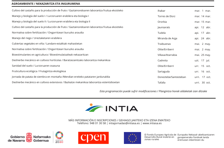 Por último, la programación de final de año en formación incluye una parte relacionada con el llamado agroambiente con distintos aspectos como el manejo y la microbiología del suelo, el cultivo del castaño o las cubiertas vegetales en viña.