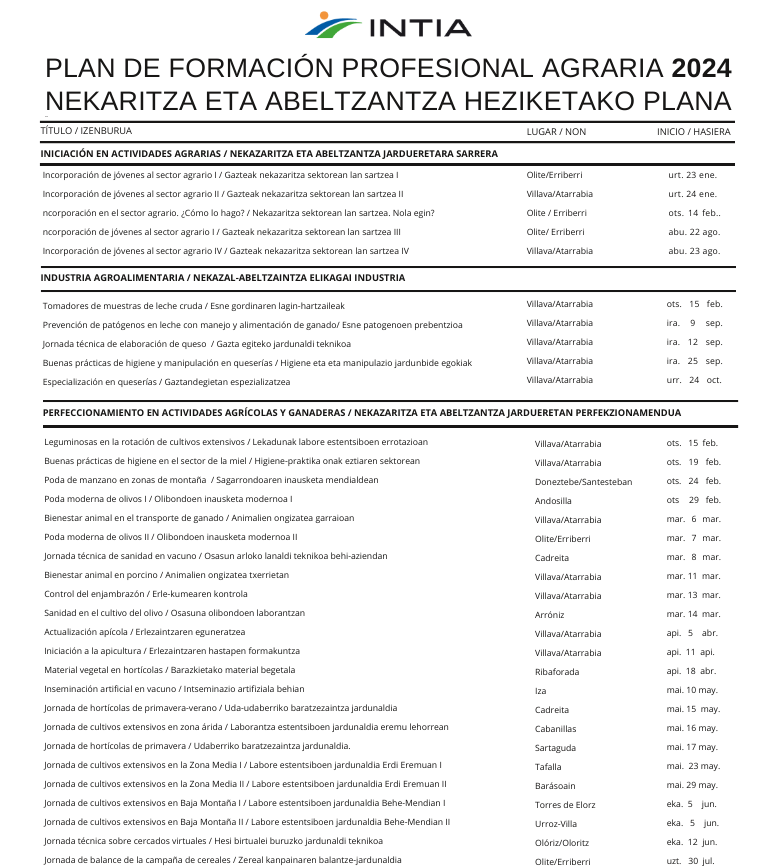 27 de febrero de 2024.- El Plan de Formación Profesional Agraria de este año 2024 incluye un total de 82 cursos de diversos temas y contenidos, siempre relacionados con las distintas actividades agrarias. Se trata de un plan cuya programación está ya planteada para todo el ejercicio y cuyo contenido está pensado a partir de la demanda y necesidades detectadas tanto por el personal técnico de INTIA y el Departamento de Desarrollo Rural y Medio Ambiente, como por distintos agentes del sector primario en Navarra.