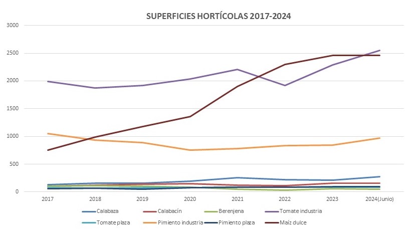 Otros tipos de cultivo que se incrementa en los últimos años en Navarra es la calabaza con un crecimiento del 75% o el de maíz dulce que, aunque ocupa prácticamente la misma superficie que en 2023, registra el doble de ocupación de parcelas que hace 5 años y el triple que hace 10. Por otra parte, la superficie de pimiento de industria, así como de otros productos hortícolas no varía con respecto a otras campañas, según estos mismos registros.